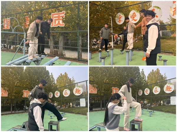 活动以“梅花桩”“礼让通行”和“盲目障碍”三个项目展开。“梅花桩”环节中,队员们需手牵手共同行走于高低不一、间距不等的木桩之上,是对个人平衡能力的考验,更是对团队默契与协作精神的极致挑战。同学们从一开始的步履不稳、相互牵扯,到后期逐渐找到节奏,通过语言提醒和肢体配合,最终所有小组均顺利完成挑战,现场掌声与欢呼声不断。“盲目障碍”环节,则是一场对沟通与信任的深度考验。参与者需蒙上双眼,在队友清晰、准确的语言指引下,穿越高低起伏、曲折复杂的障碍路径。学生学会倾听、依赖与责任,每一步前行都凝聚着同伴的关心与支持。活动最后,全体学生合影留念。