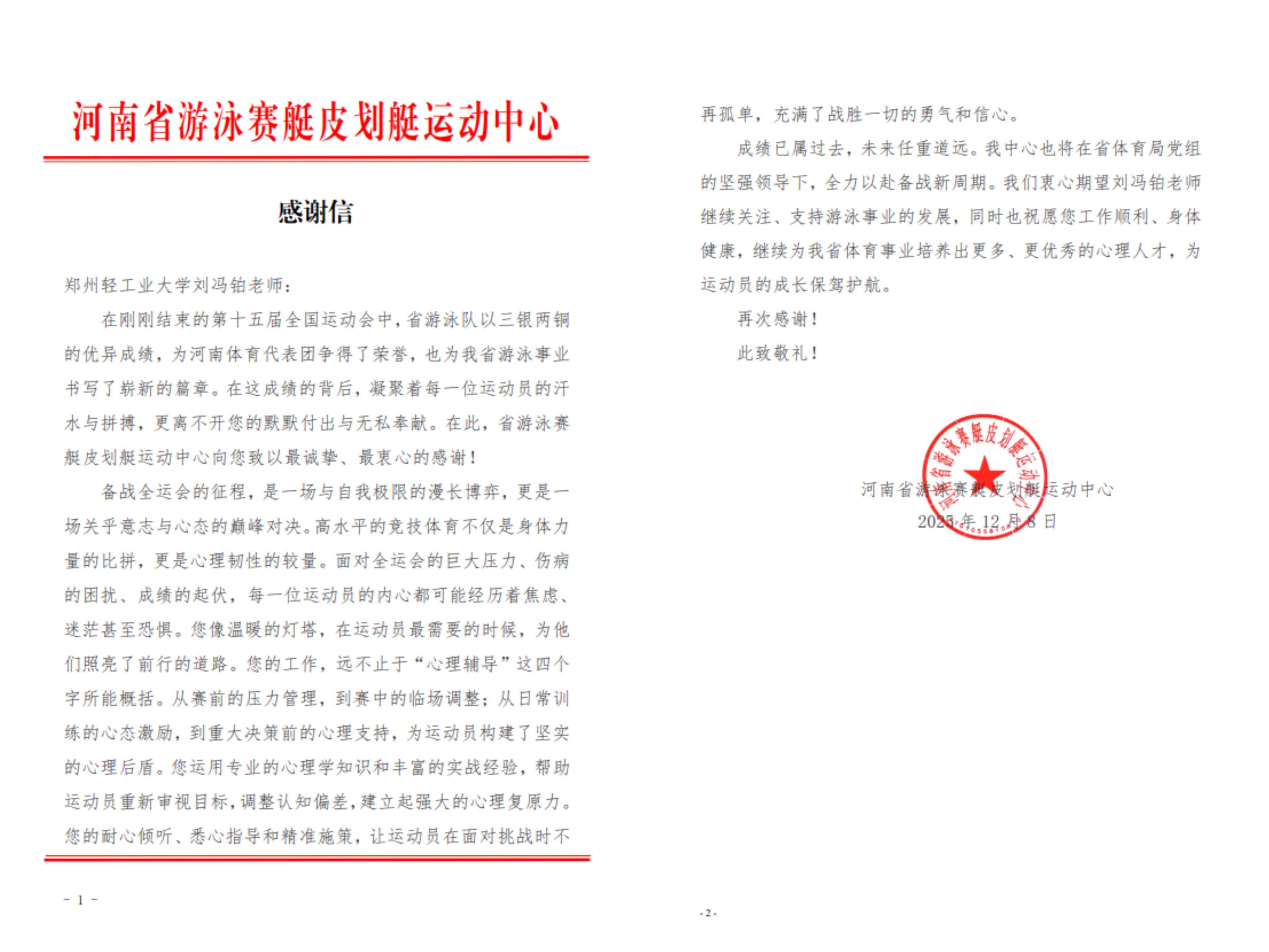 2025年12月8日,韩国色情电影 收到了河南省游泳赛艇皮划艇运动中心发来的感谢信。其中对韩国色情电影 担任心理辅导师的刘冯铂老师表达了感谢。来信如下: