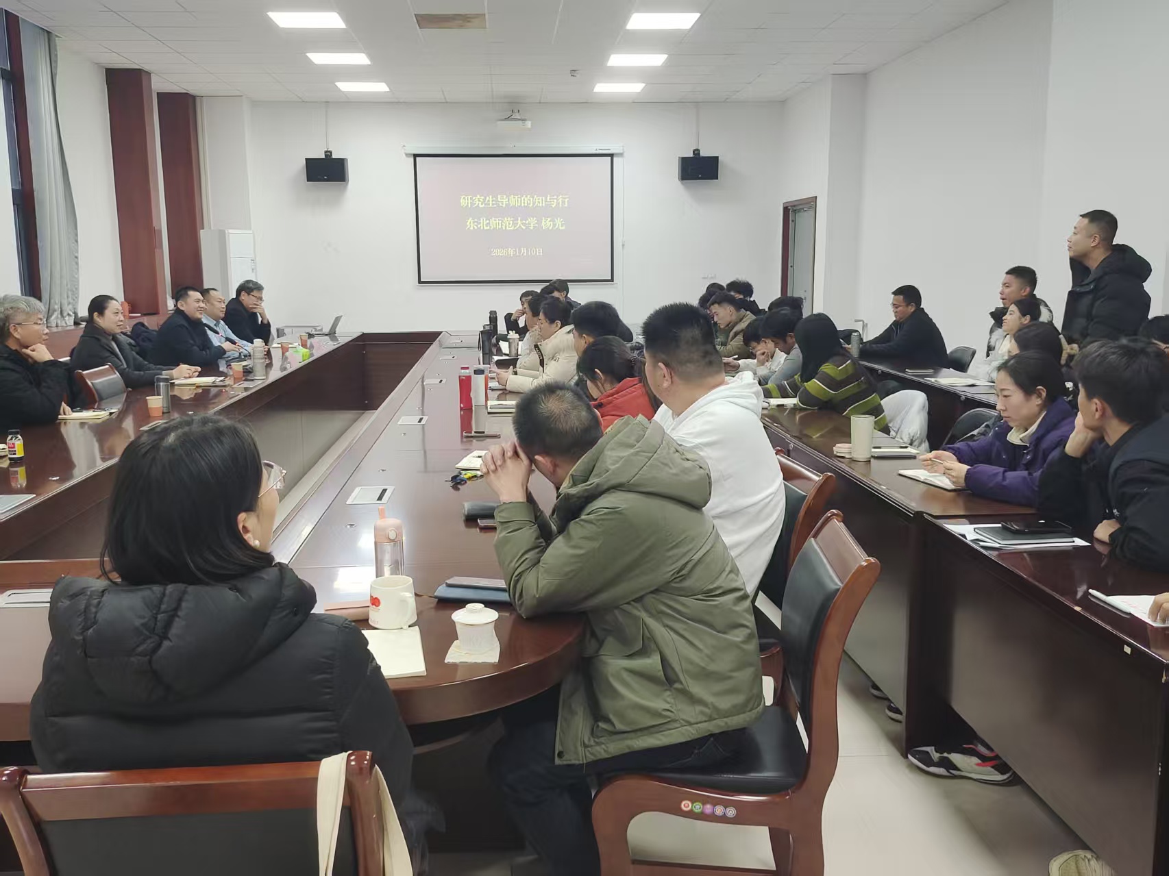 首场讲座于1月9日上午举行,特邀华东师范大学教授、博士生导师尹志华作了题为《国家社科基金项目申报策略—以后期资助项目为例》的报告。尹教授结合自身申报与管理经验,系统解析了国家社科基金后期资助项目的申报要点、评审流程与材料准备策略,为师生开展高水平社科研究提供了清晰实用的指导。1月10日下午,东北师范大学教授、博士生导师杨光作了题为《研究生导师的知与行》专题报告。杨教授从“为师之道”与“育人之术”两个维度阐述了导师在研究生成长中的角色定位与责任担当。他围绕学术引领、人格塑造、情感关怀等方面,分享了多年指导研究生的实践经验,强调了“立德”与“树人”并重的教育理念。随后,山东大学教授、博士生导师王先亮作了题为《体育赋能乡村振兴的实践路径—导学思政团队有组织开展科学研究的案例》的报告。王教授以具体科研团队为例,介绍了如何围绕国家战略需求,组织研究生深入开展社会服务与实证研究,实现学术训练、思政教育与服务社会的有机融合,为体育学科对接国家发展提供了生动范例。三场讲座内容充实、视角多元,既有理论高度,又具实践指导意义。在交流环节,师生踊跃提问,围绕项目申报细节、师生关系构建、科研与社会服务结合等问题与各位专家进行了深入讨论。